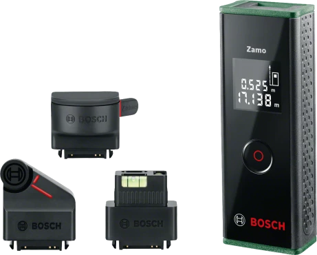 - Le set Zamo comprend trois adaptateurs pratiques brevetés par Bosch pour un large éventail de tâches : un adaptateur de roue mesure facilement les courbes et les surfaces irrégulières, tandis que l’adaptateur de ligne est parfait pour aligner des objets.