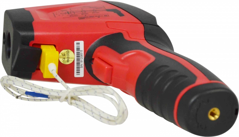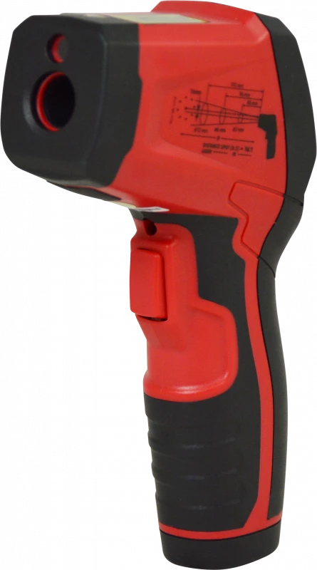 - Thermomètre infrarouge pour la mesure sans contact de la température de surfaces (dangereuses, en mouvement) entre -50°C et +800°C avec une précision de 1%.
